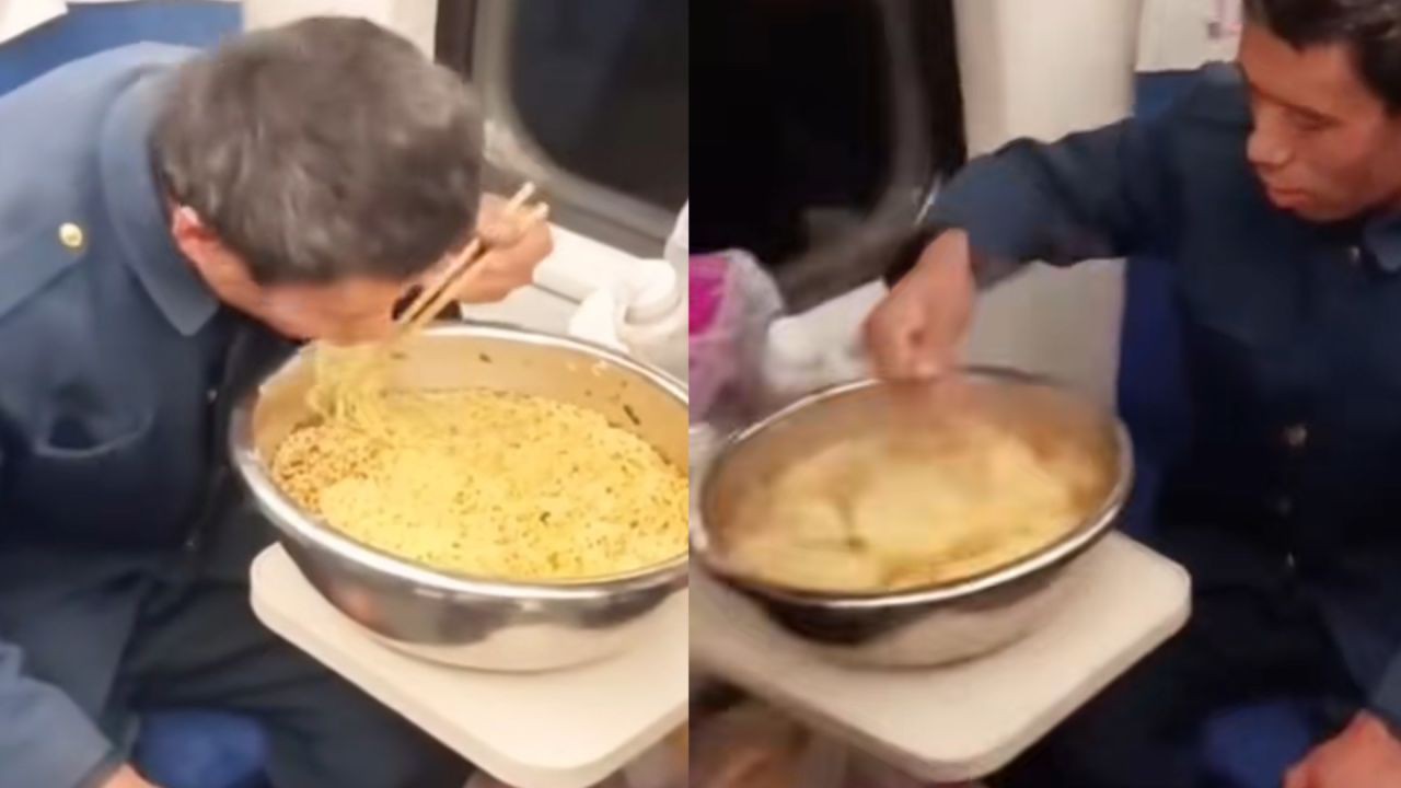 据悉,3月6日晚,在一辆从浙江余姚开往河南商丘的火车上,一位穿着朴素的农民工大哥正用筷子搅拌着一大盆的泡面,引来不少同行乘客的围观。