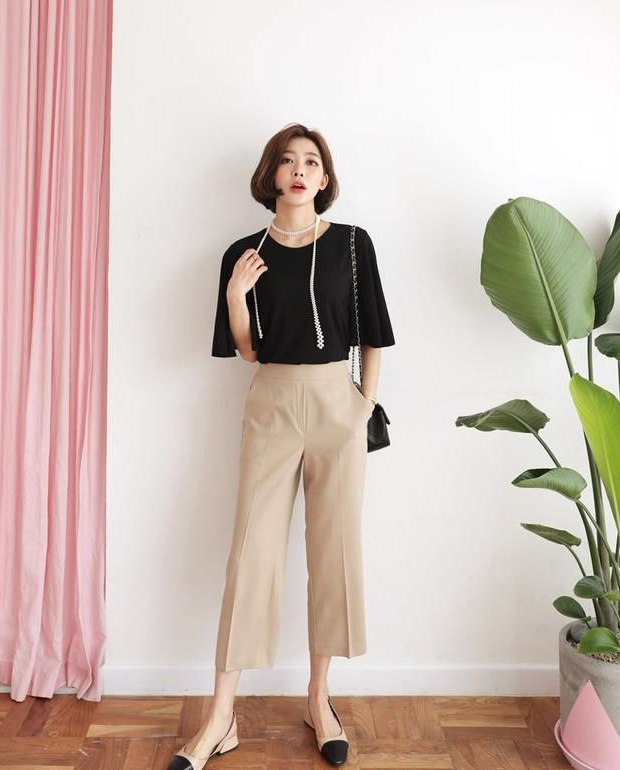 简单黑色T恤搭配米杏色九分裤、女神鞋