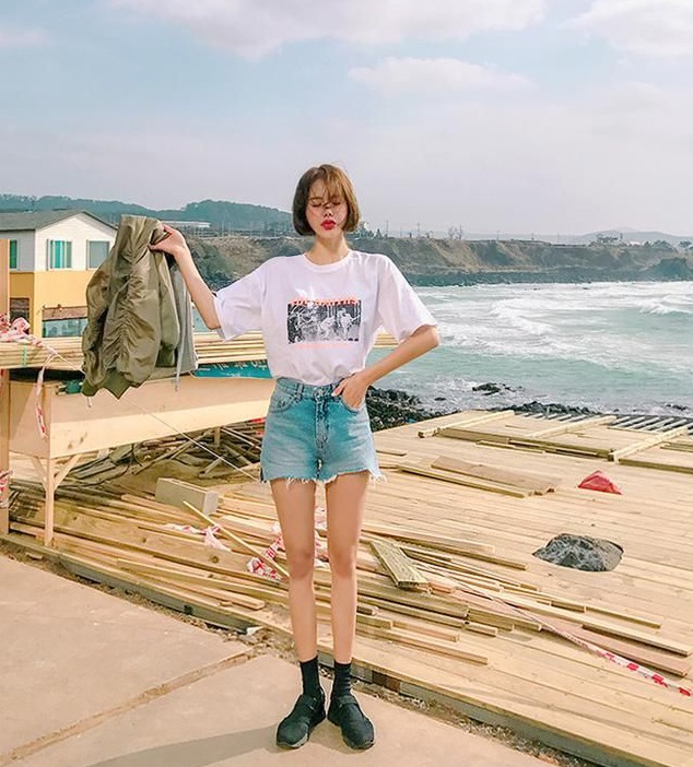 短款宽松上衣搭配牛仔短裤、黑色鞋子