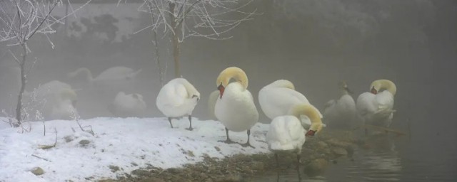 2、天鹅在我国的分布:它们在我国的北部和西部繁殖,在华中及东南沿海越冬。每年9月中旬南迁,常常6~20余只组成小群,排成“一”字或“人”字队行,边飞边鸣。在我国雄伟的天山脚下,有一片幽静的湖泊——天鹅湖,每年夏秋两季,这里有成千上万的天鹅在碧绿的水面漫游,就像蓝天上飘动着的朵朵白云,好看极了。