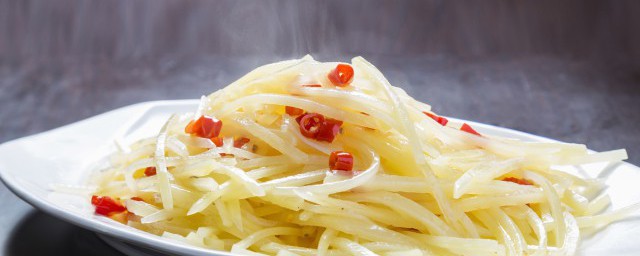 2、土豆去皮洗净切成丝,放入水中洗去表面淀粉,沥干水分备用。