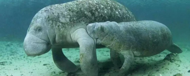 2、海牛外形呈纺锤形,颇似小鲸,但有短颈,与鲸不同。体长2.5-4.0米,体重达360千克左右;海牛皮下储存大量脂肪,能在海水中保持体温;前肢特化呈桨状鳍肢,没有后肢,但仍保留着一个退化的骨盆;有一个大而多肉的扁平尾鳍;躯干基本无毛,仅嘴唇周围有须,头部有触毛;头大而圆,唇大,由于短颈,头能灵活地活动,便于取食;鼻孔的位置在吻部的上方,适于在水面呼吸;眼小,视觉不佳;高频听觉良好,低频则退化。
