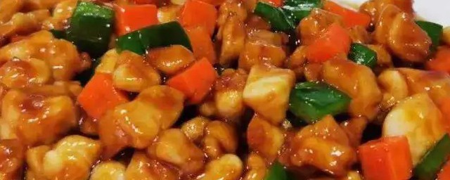 5、锅中倒入适量的炒菜油,约5成热的时候滑入鸡丁,炒制变色后捞出控油备用。