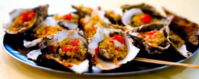 5、将腌制好的蚝肉放入洗净的蚝壳内,将调制好的蒜茸铺在蚝肉上面。