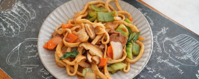 5、待菜炒至八成熟时下入面条,翻炒几分钟装盘,撒入少量鸡精即可。