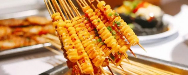 3、将一根牙签从凹槽旁边的玉米粒中用力穿过去,将七八颗玉米粒穿成一串。