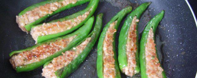 10、平底锅放入食用油烧热,放入酿好的辣椒,有肉的一面朝下。