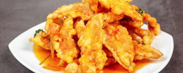 4、锅中油五六成热时,一片片下入裹好面糊的肉片,中火炸熟,捞出。将火调至大火,放入炸过的肉片,大火炸至焦脆、上色。