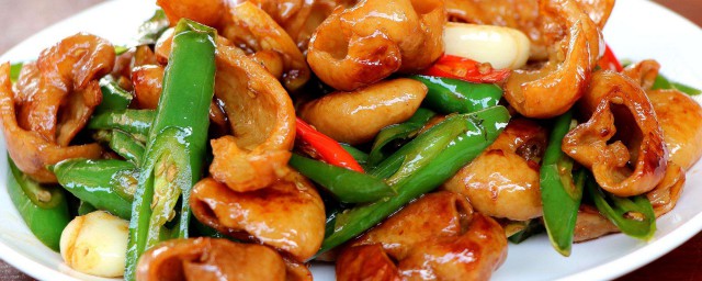 5、油烧到7成热时放入生姜、豆瓣酱、老抽等调料,出香即可。倒入切好的肥肠翻炒5分钟,最后倒入青辣椒、红辣椒、洋葱翻炒,加水,焖10分钟烧干水,就可以起锅食用了。