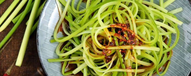 6、将调好的调味料浇在蒜苔丝上即可。