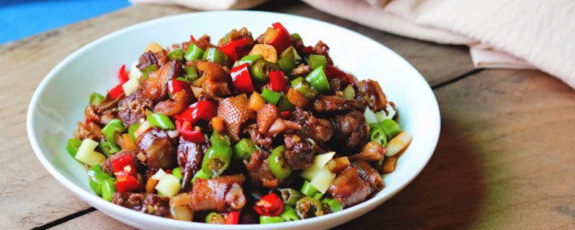 5、倒入鸭肉中火翻炒。