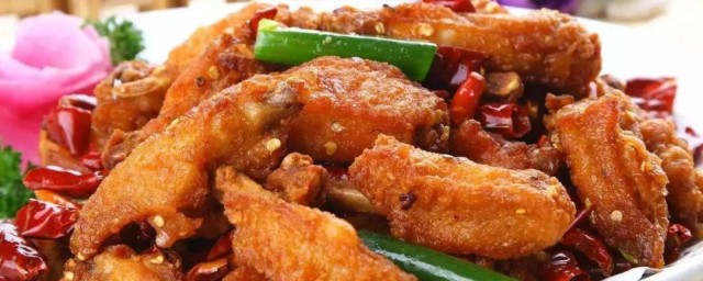 2、做法:把鸡翅宰成小块,用料酒少许、糖少许、老抽、白胡椒粉、生抽和姜片码味半小时以上;青椒切成1厘米左右的段,蒜切片。花椒备用;热锅冷油。将花椒和蒜片放入油中爆香。把鸡翅和干辣椒倒入,改用稍小的火将鸡翅中的水分。倒入青椒、麻花,同炒。炒熟之后放盐和味精调味,便可上桌。