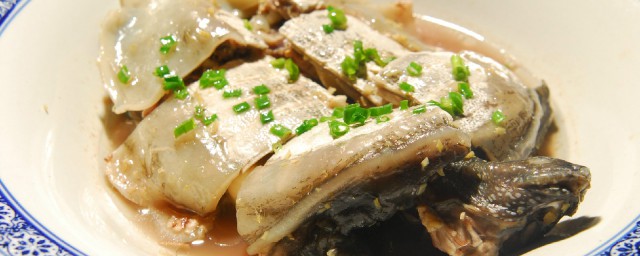 3、将甲鱼宰杀后,斩去头和爪尖,洗净。把葱姜放一些在甲鱼肚子里,将盐、葱、姜片放在甲鱼上面,再倒入料酒。水沸后约蒸40分钟至软烂取出。