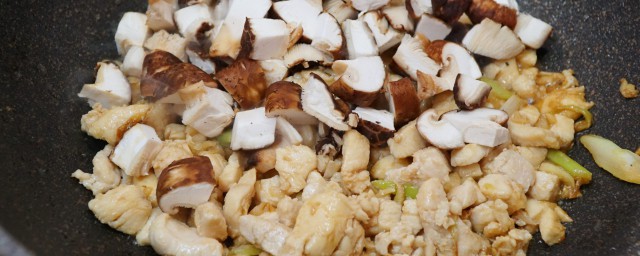 6、放入香菇翻炒,因香菇事先已经焯过水,以是翻炒时间要短。