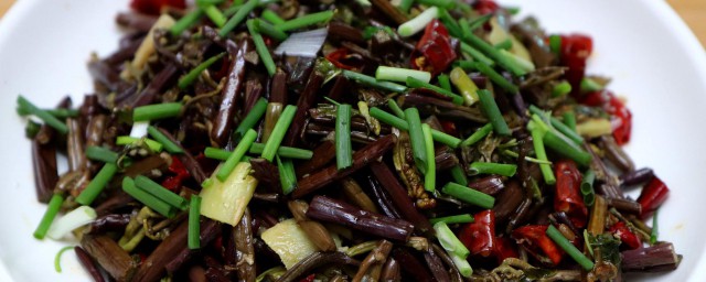 5、将春笋丝倒入锅中用余油煸炒,倒入蕨菜翻炒均匀,再倒入肉丝翻炒至全熟,放入食盐,鸡精调味即可出锅。